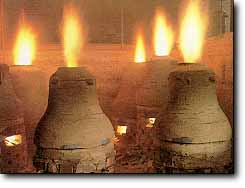 Die Formen werden dann in der Erde vergraben. Nun kann die Glockenspeise, so nennt man die flüssige Bronze, über Flußkanäle in die einzelnen Formöffnungen fließen.